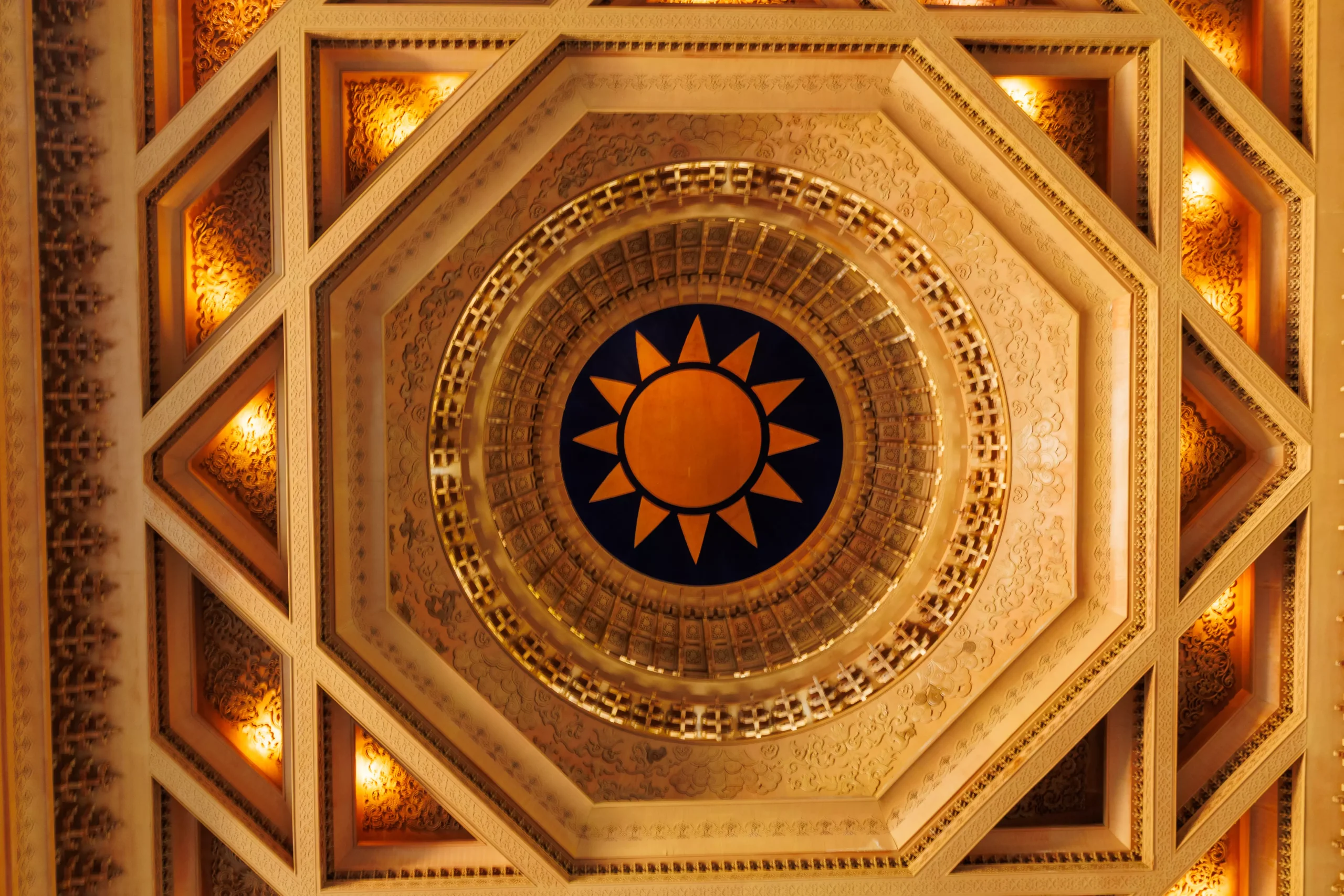 Inside the main hall the ceiling is the thing. I had seen photographs of it before but I was not expecting how perfectly centred it is, or how the geometric pattern draws your eye directly to the twelve-pointed sun emblem at the very centre. Lying on your back to photograph it straight up is the only way to get the full symmetry, and it is absolutely worth looking slightly odd in front of other visitors to do so.