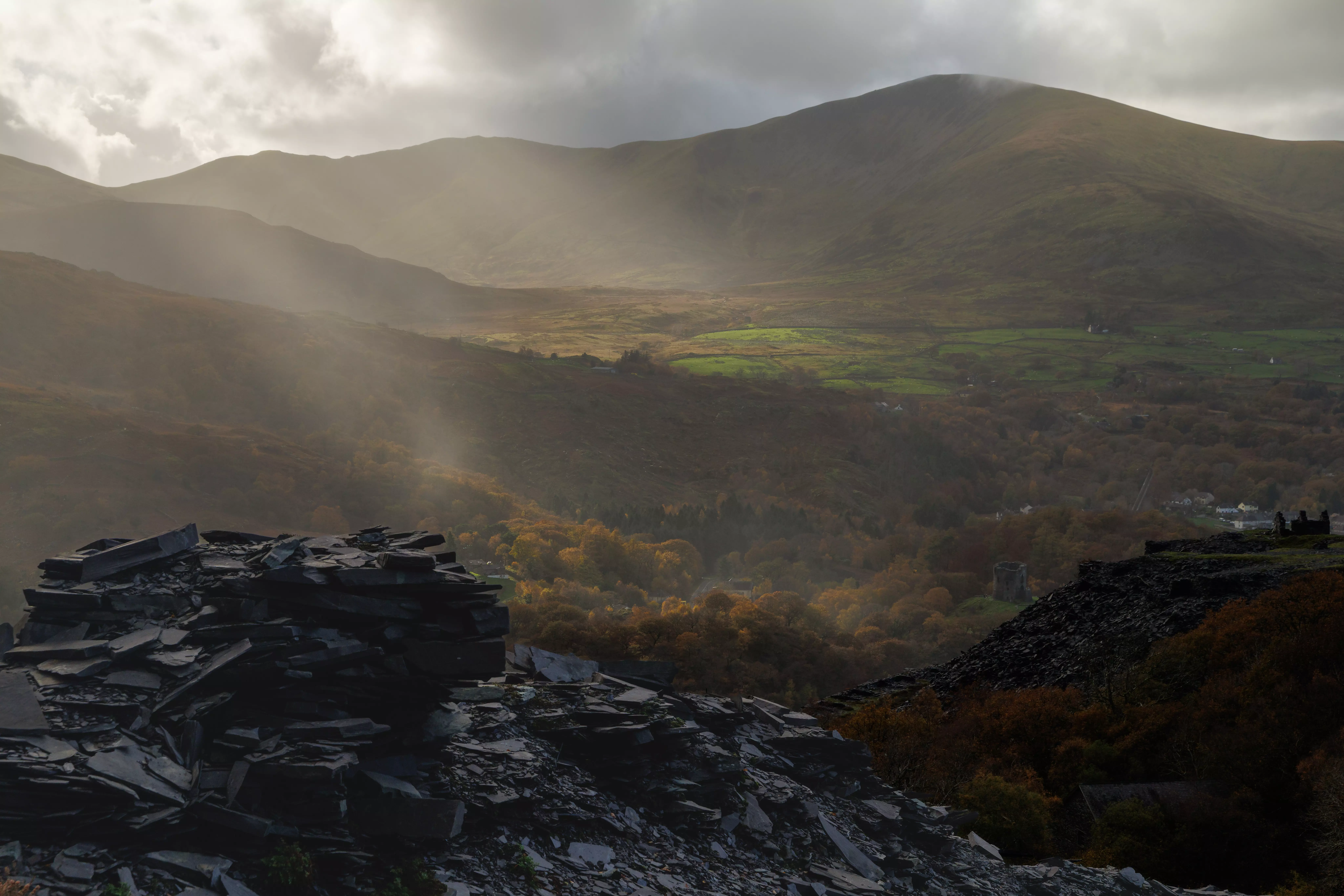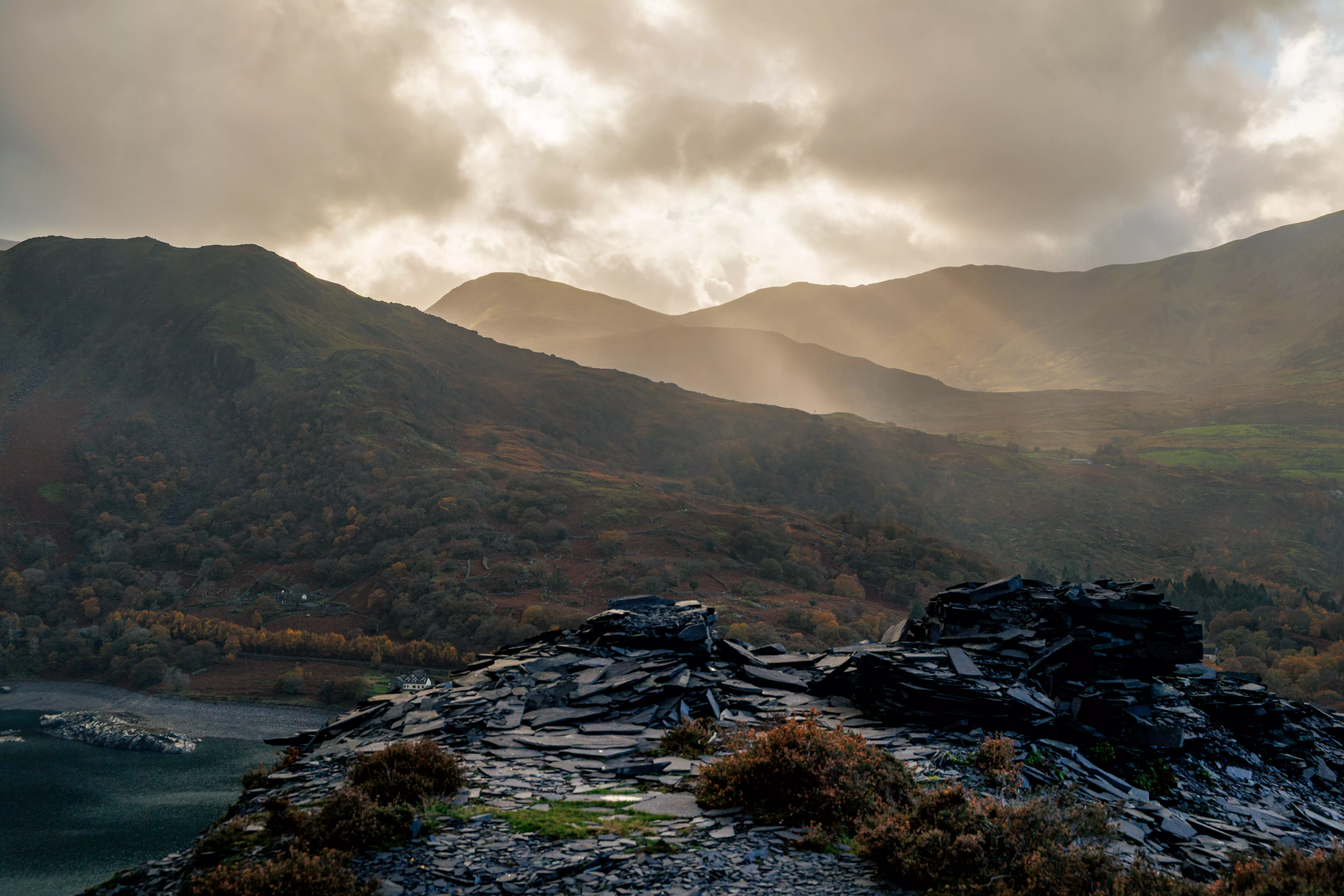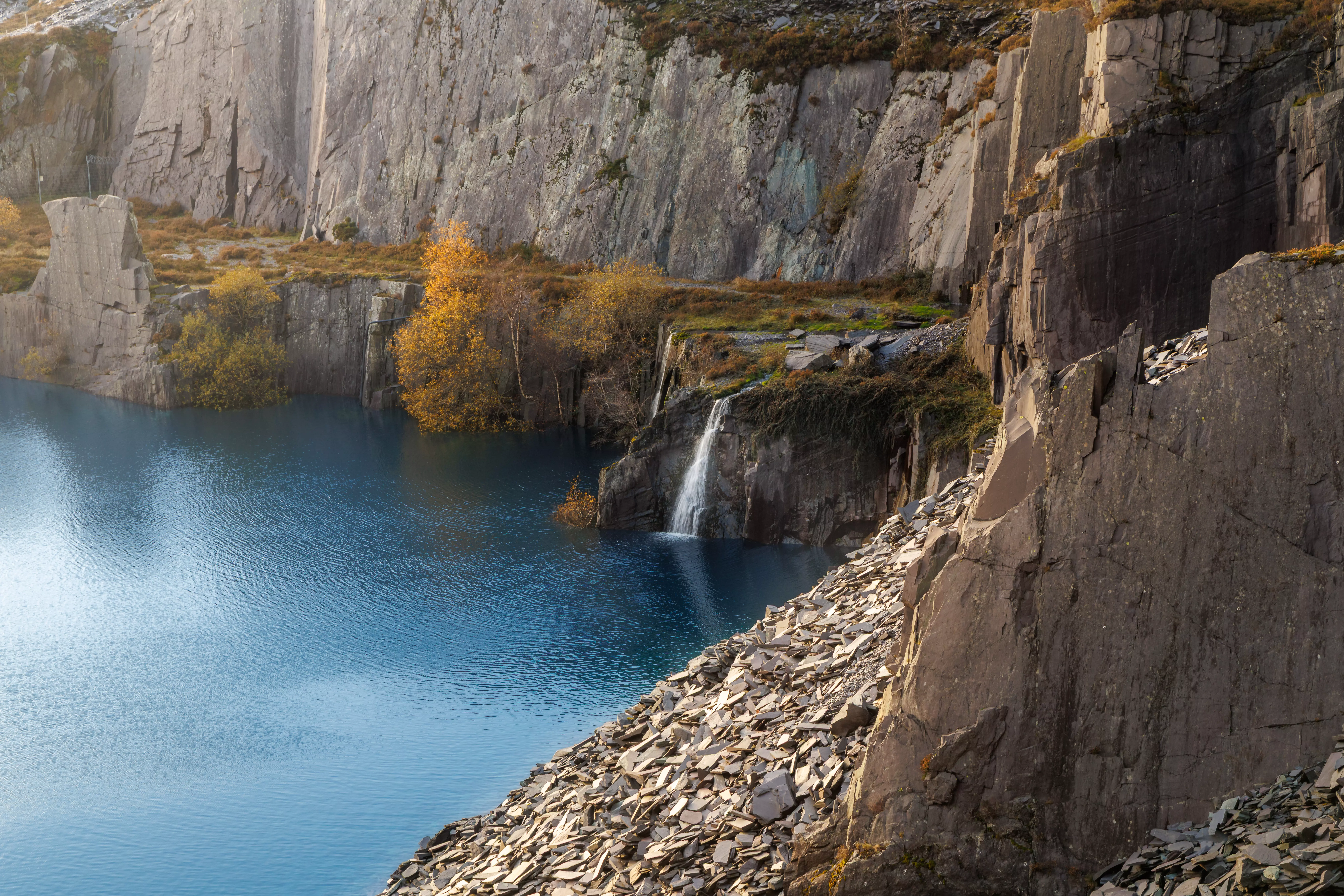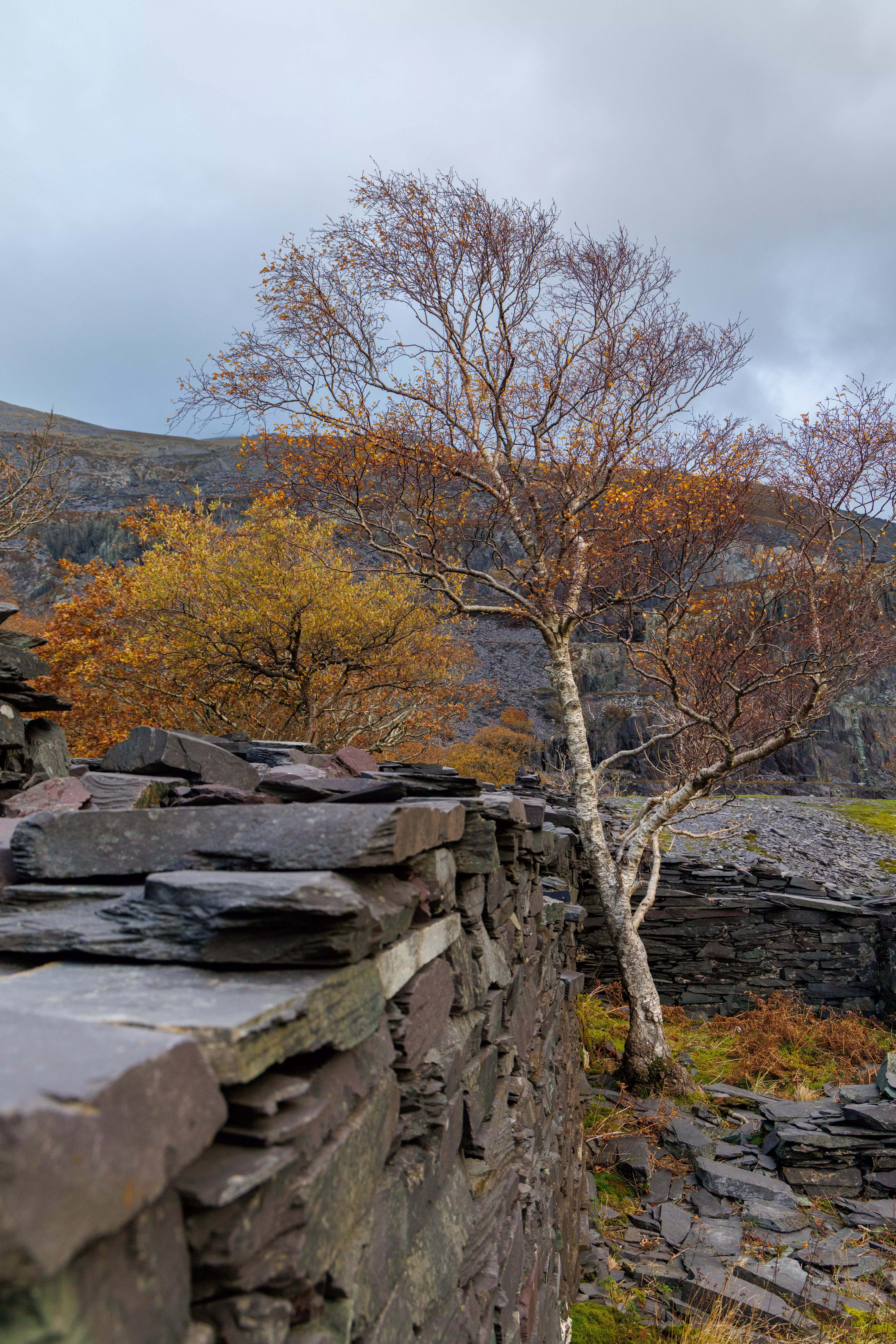 I visited in late autumn, which turned out to be exactly the right time. The woodland that has grown back through the lower quarry levels was in full colour — deep amber and copper oak, golden birch — and the contrast between that warmth and the cold blue-grey of the slate was extraordinary. The light that day shifted constantly. One moment the whole valley would flatten under heavy cloud; the next, shafts of sunlight would break through and light up patches of the hillside like a spotlight moving across a stage. You spend a lot of time on a quarry like this just watching and waiting.