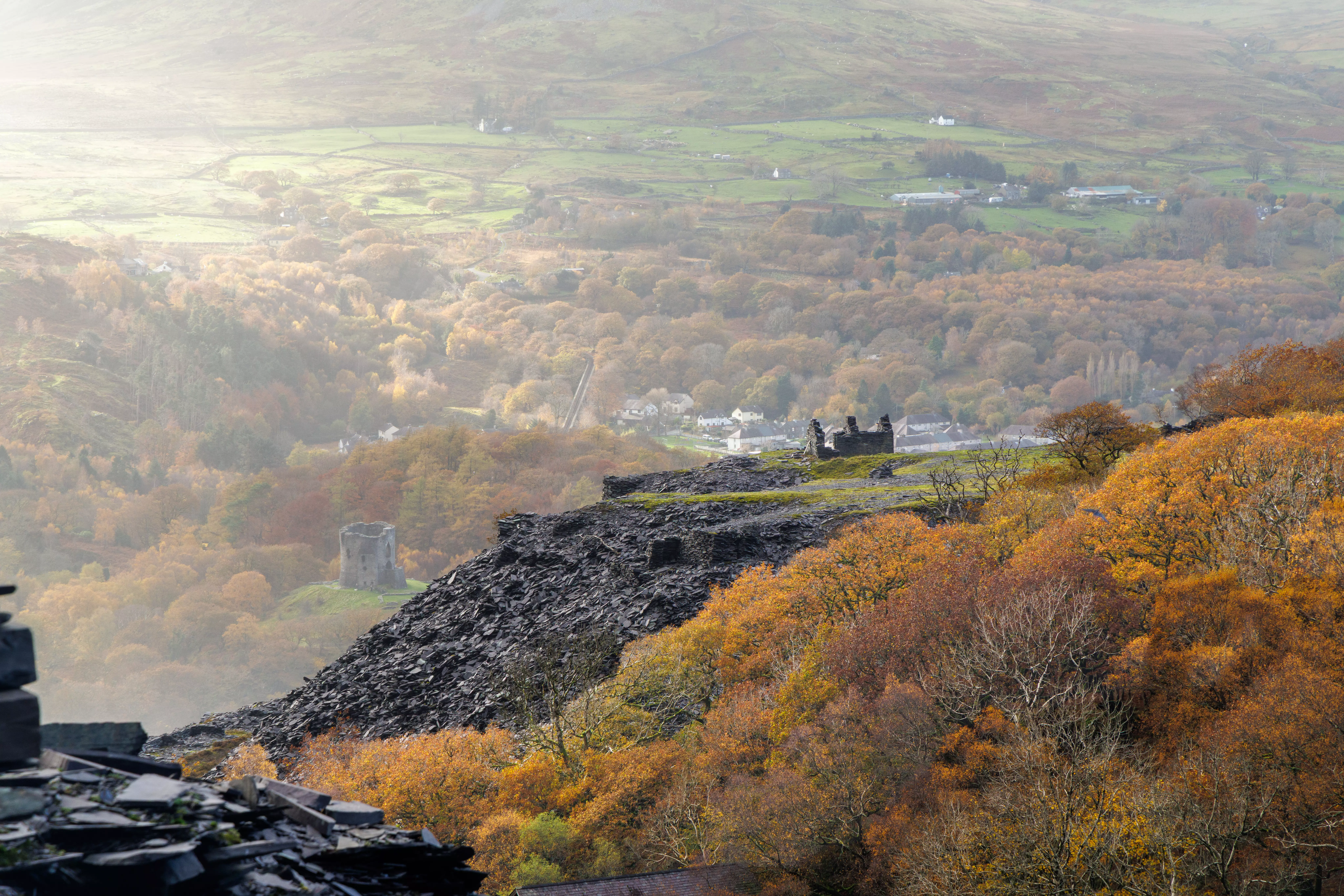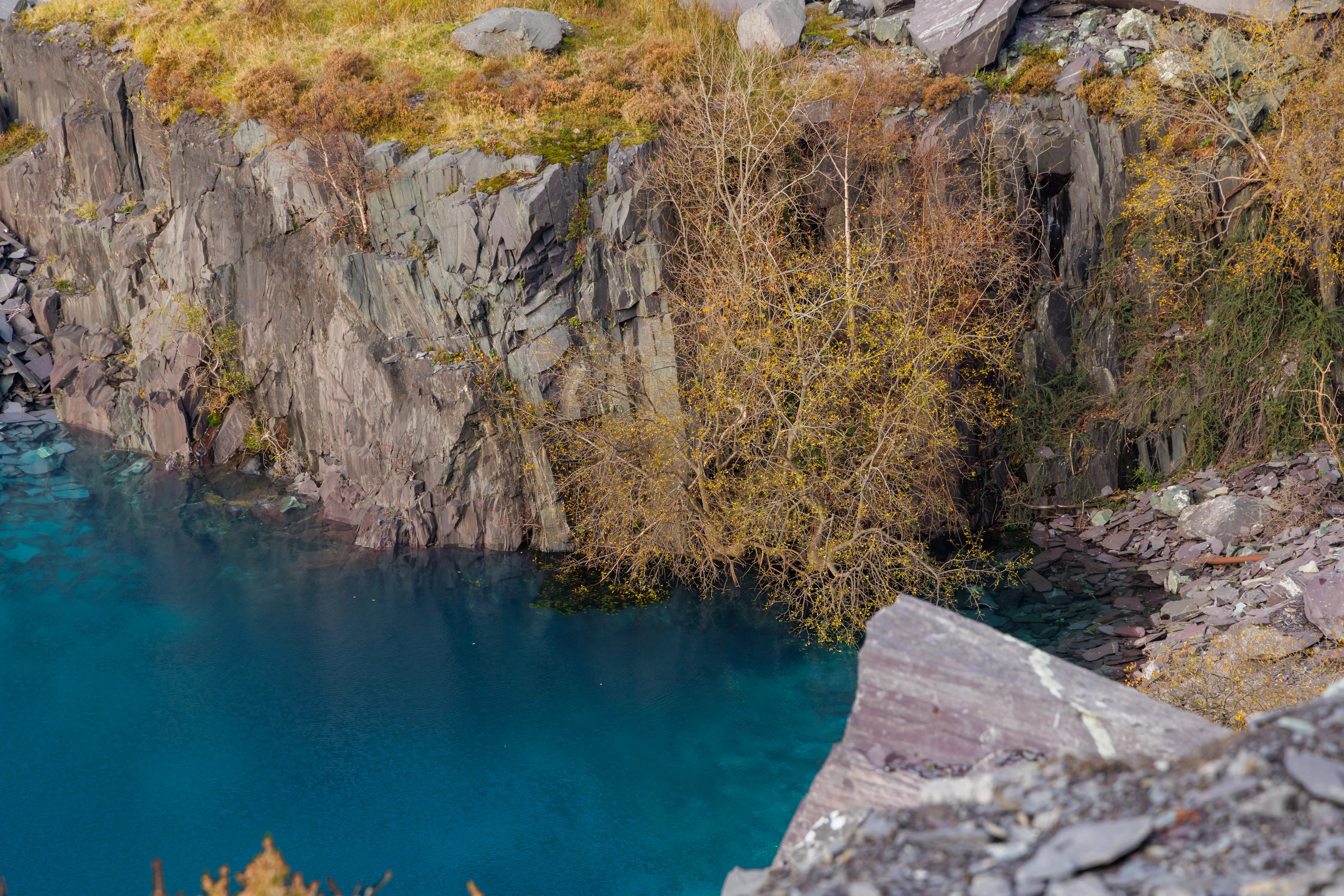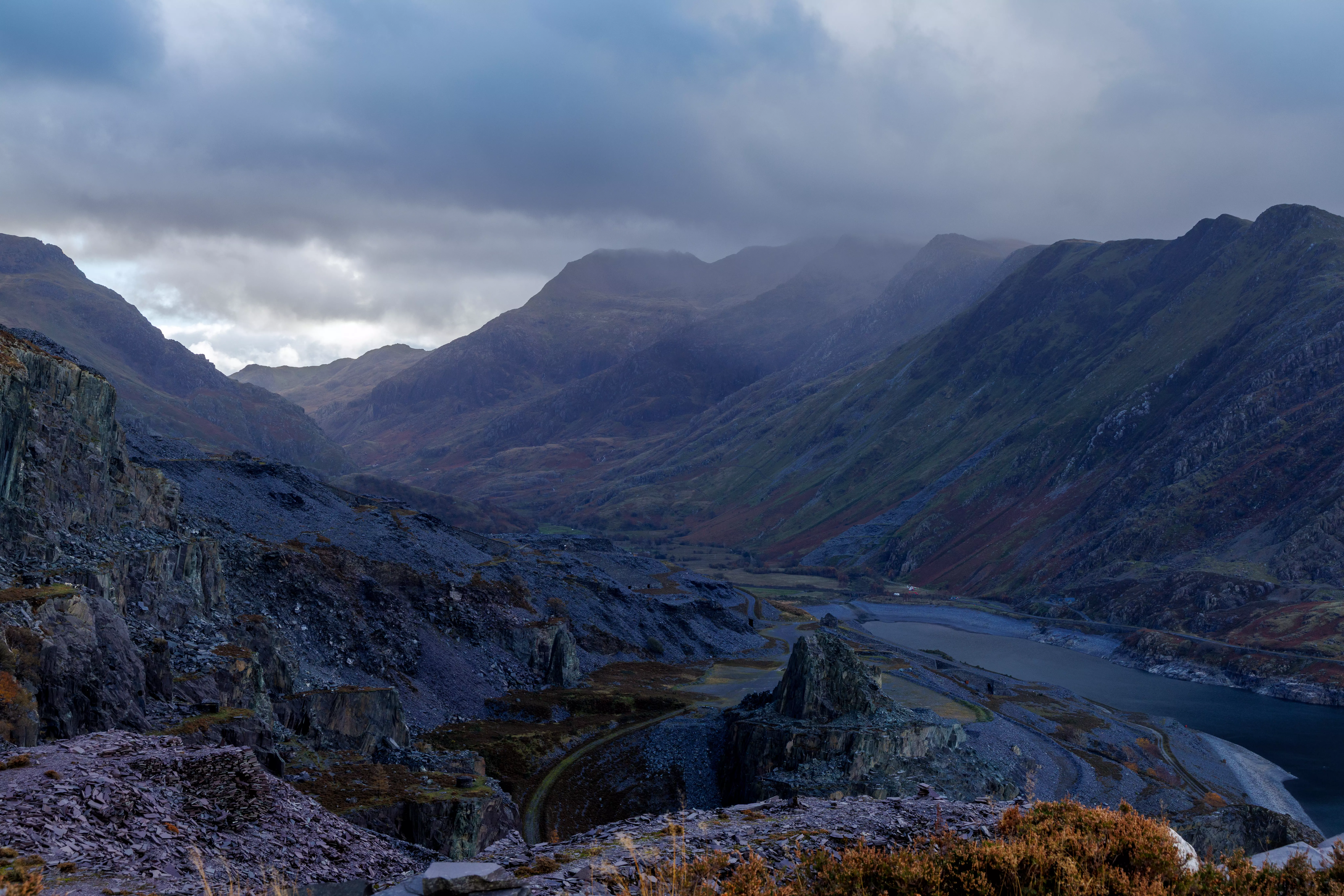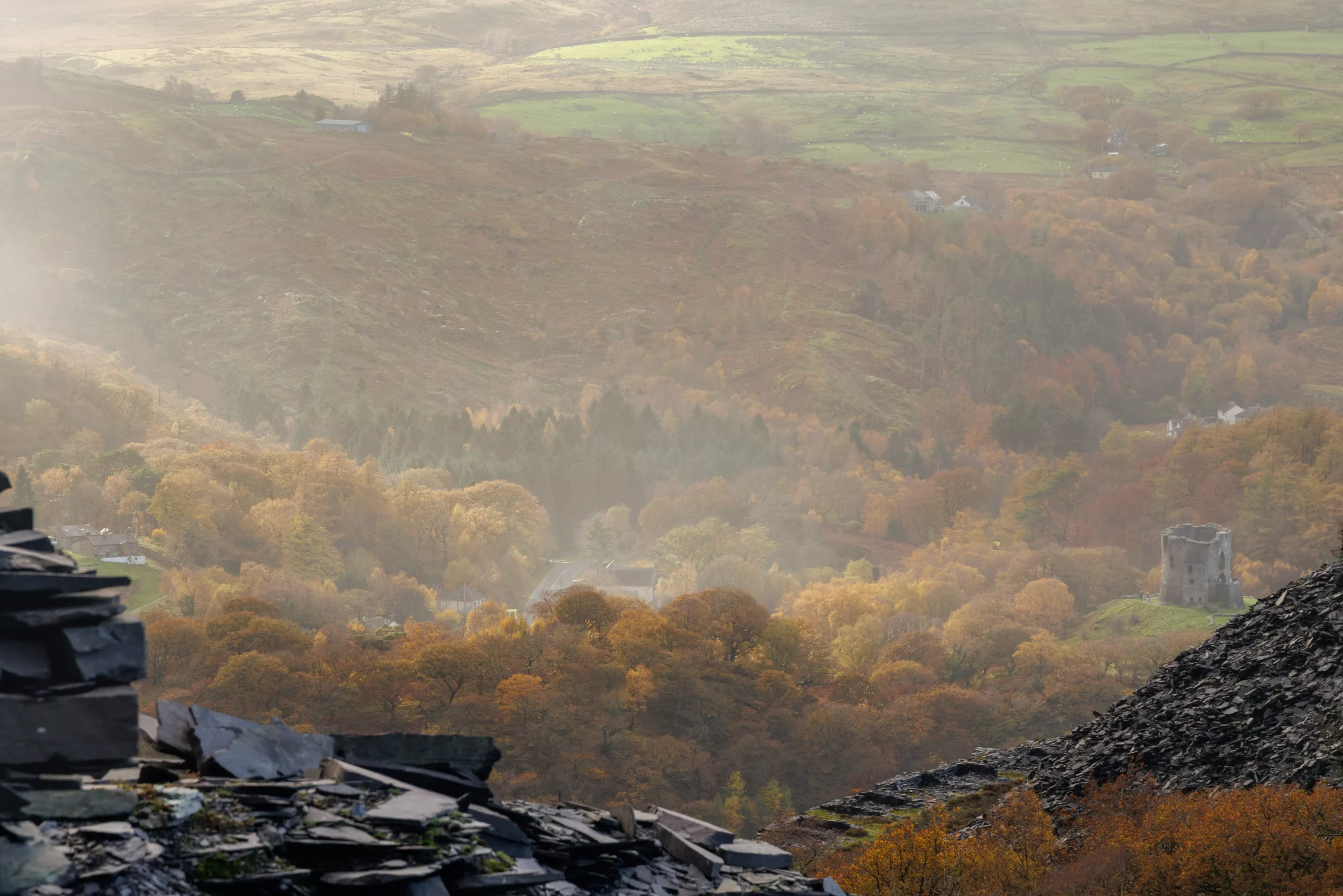I visited in late autumn, which turned out to be exactly the right time. The woodland that has grown back through the lower quarry levels was in full colour — deep amber and copper oak, golden birch — and the contrast between that warmth and the cold blue-grey of the slate was extraordinary. The light that day shifted constantly. One moment the whole valley would flatten under heavy cloud; the next, shafts of sunlight would break through and light up patches of the hillside like a spotlight moving across a stage. You spend a lot of time on a quarry like this just watching and waiting.