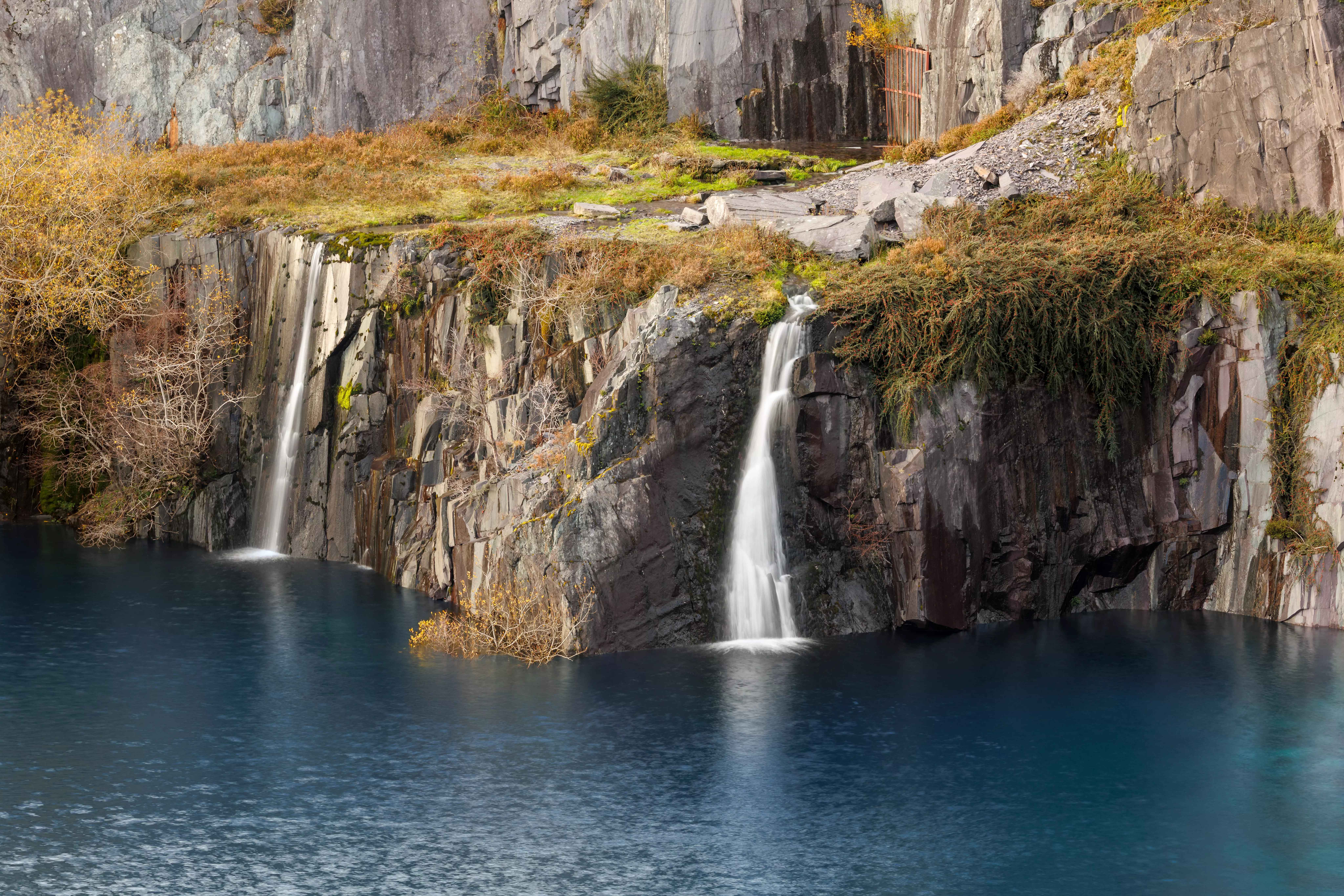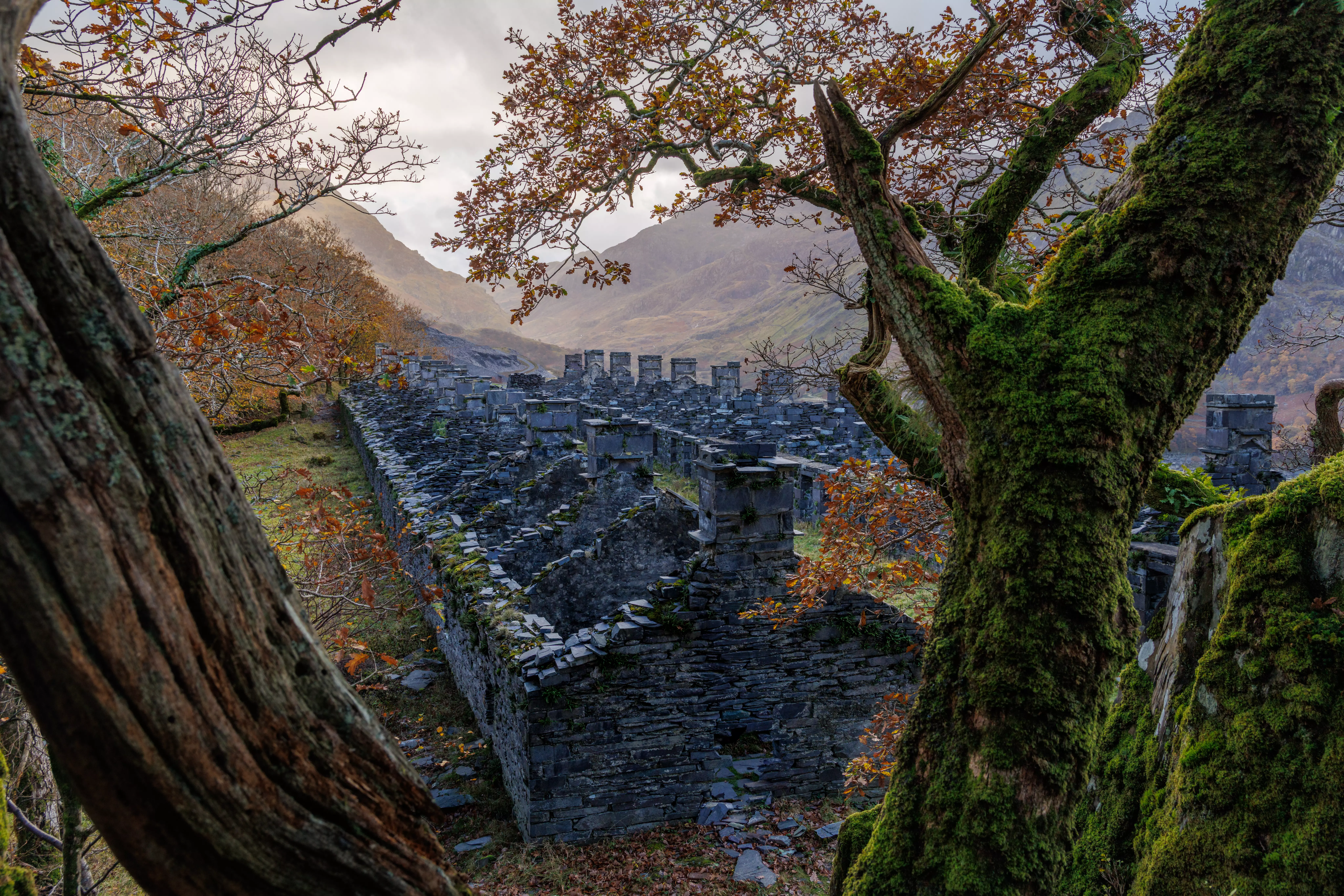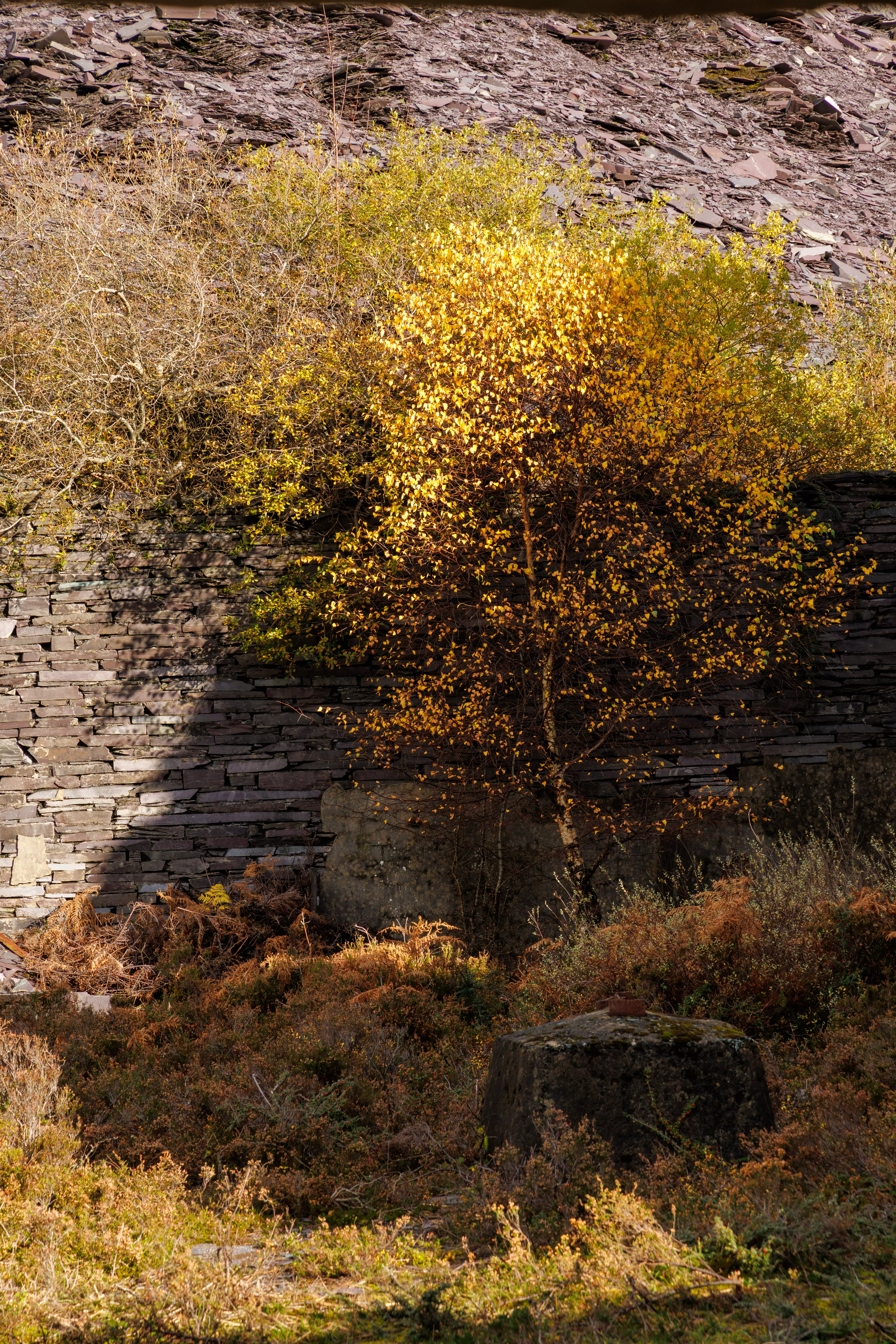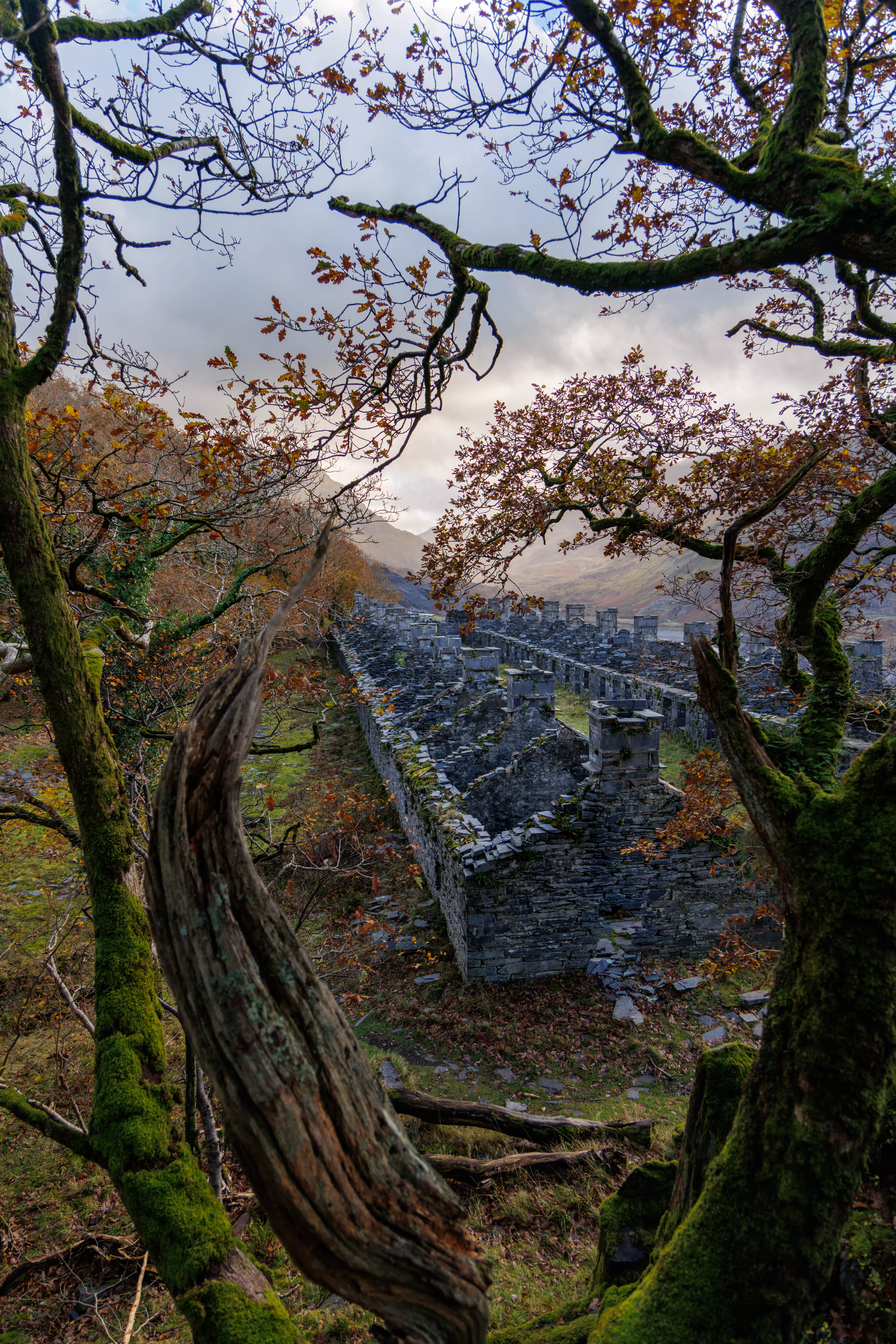 I visited in late autumn, which turned out to be exactly the right time. The woodland that has grown back through the lower quarry levels was in full colour — deep amber and copper oak, golden birch — and the contrast between that warmth and the cold blue-grey of the slate was extraordinary. The light that day shifted constantly. One moment the whole valley would flatten under heavy cloud; the next, shafts of sunlight would break through and light up patches of the hillside like a spotlight moving across a stage. You spend a lot of time on a quarry like this just watching and waiting.