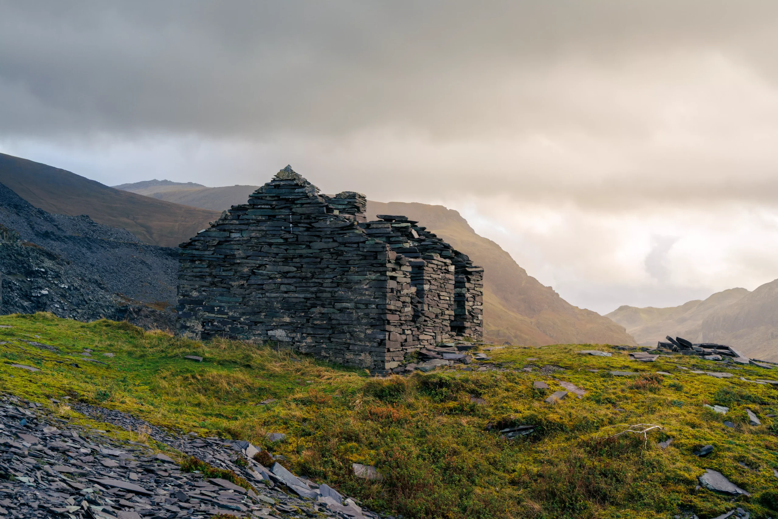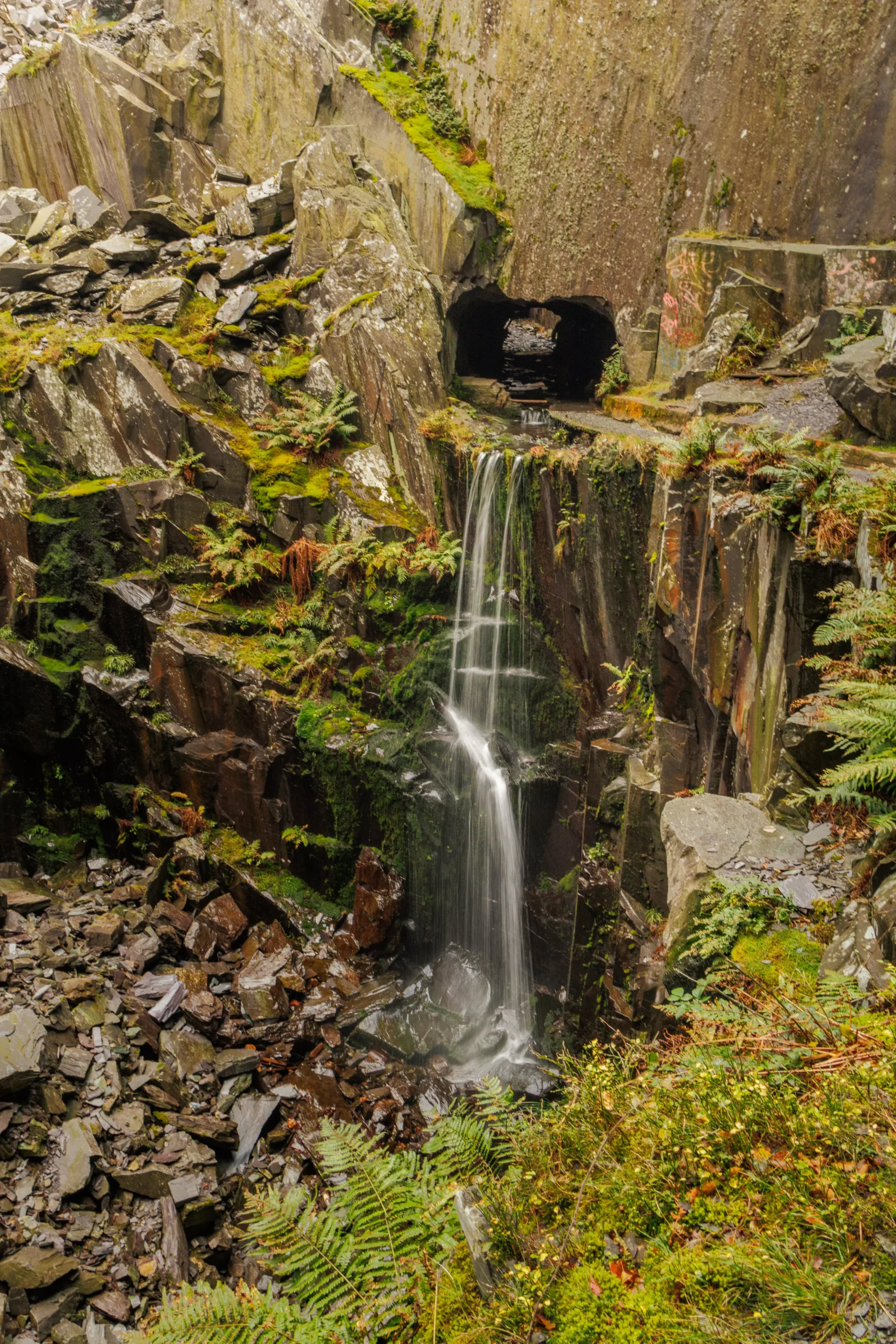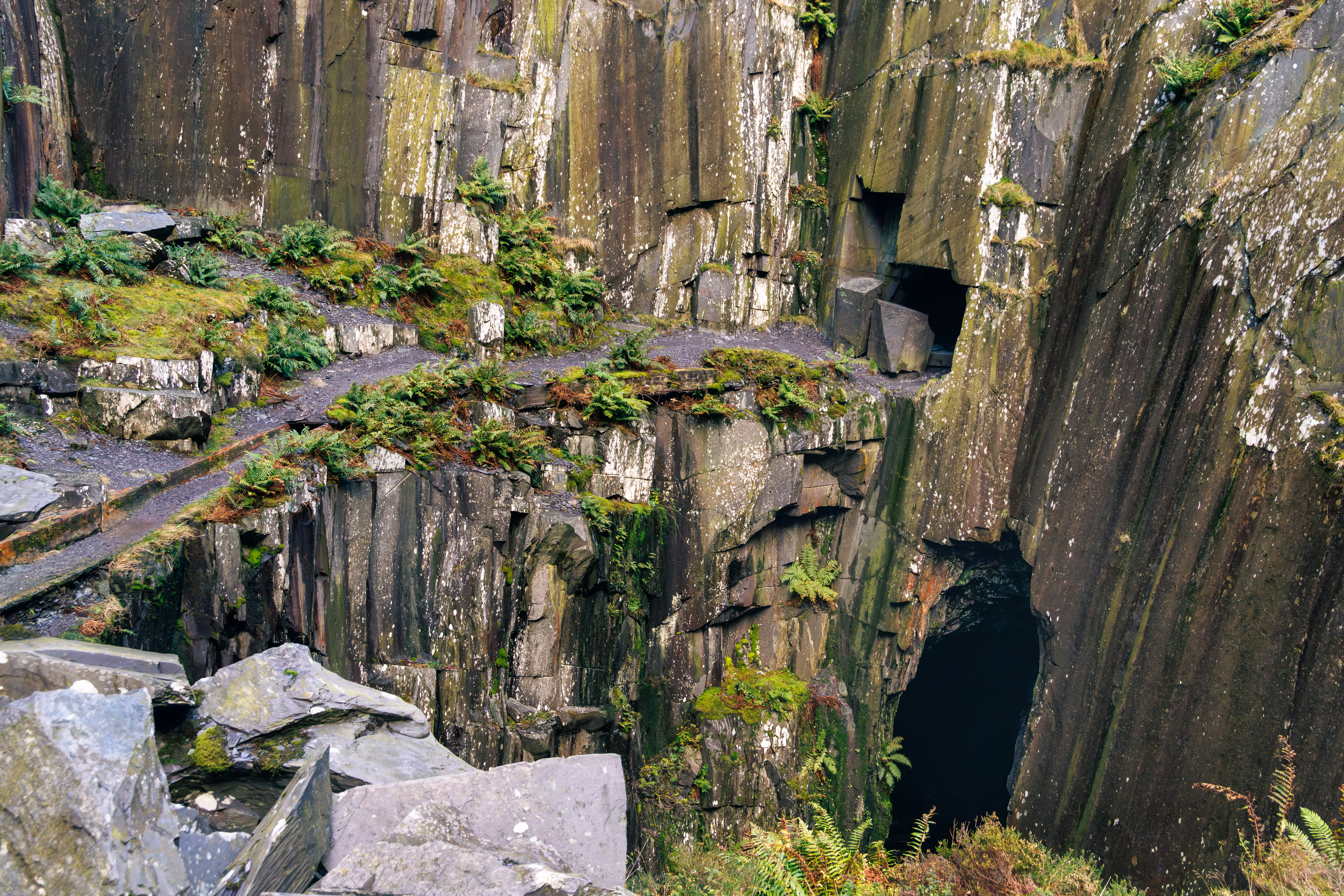 Getting around Dinorwig takes longer than you might expect. The terraced levels don't connect easily, and some of the most interesting corners — the Anglesey Barracks, the flooded pits, the old tunnel entrances — require a bit of picking your way through the slate debris. It's worth it. Around every corner there's something that makes you stop: a waterfall appearing from nowhere out of a tunnel mouth, a wild goat picking its way through the ruins with complete indifference, a stencilled image of the quarry's workers ghosted onto a slate wall somewhere in the lower workings.