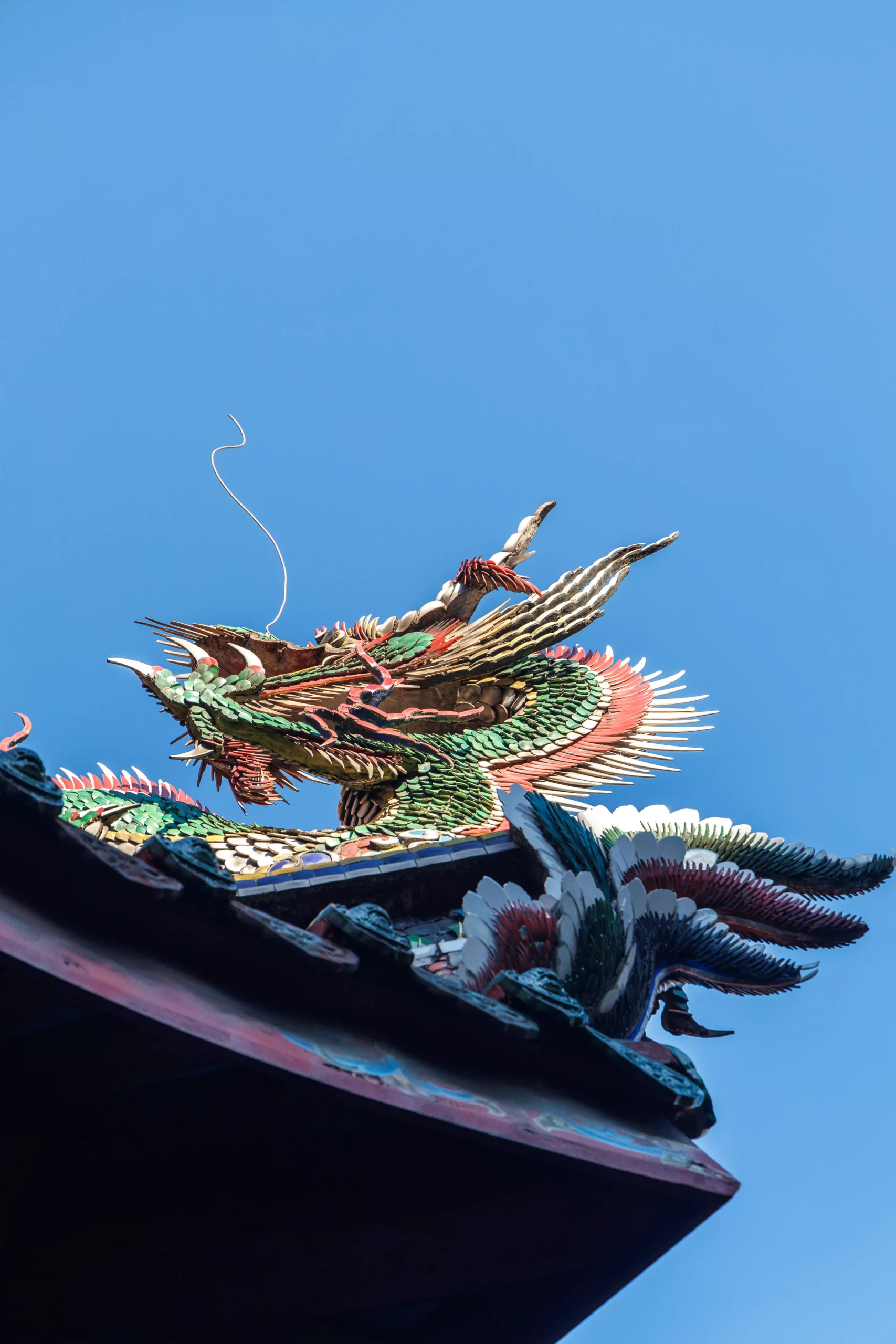 The building itself is extraordinary. The main hall sits behind a courtyard framed by dragon-wrapped stone columns, each one carved with characters and mythological figures that spiral from base to capital. The roof is the kind of thing you could photograph for an entire day and still not exhaust. Every ridge is populated with figures, every corner curves upward in that distinctive southern Fujian style that feels like it is reaching for the sky. The colour palette is intense but not garish. Deep reds, golds that have been darkened by decades of incense smoke, greens that sit somewhere between jade and verdigris.