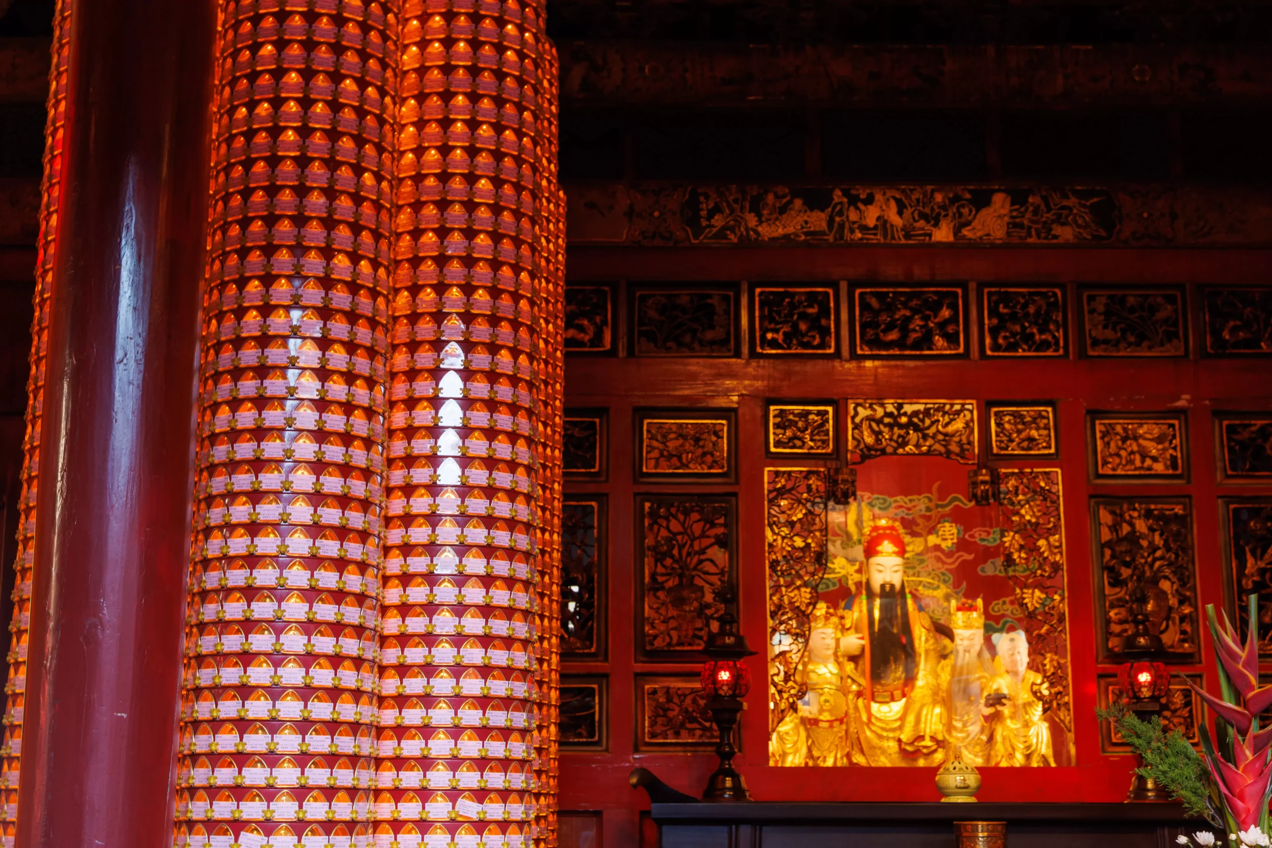 The interior shots were technically challenging. The light levels drop dramatically once you move inside the halls, and the shrines themselves glow with their own warm, amber light. The prayer tablet column I photographed had hundreds of small identical tablets stacked in rows, each one lit from within, creating a texture that looked almost like brickwork made of fire. Behind it, the golden deity figure in the shrine was perfectly lit against the dark carved panels. It took a few attempts to get the balance right without losing the atmosphere.