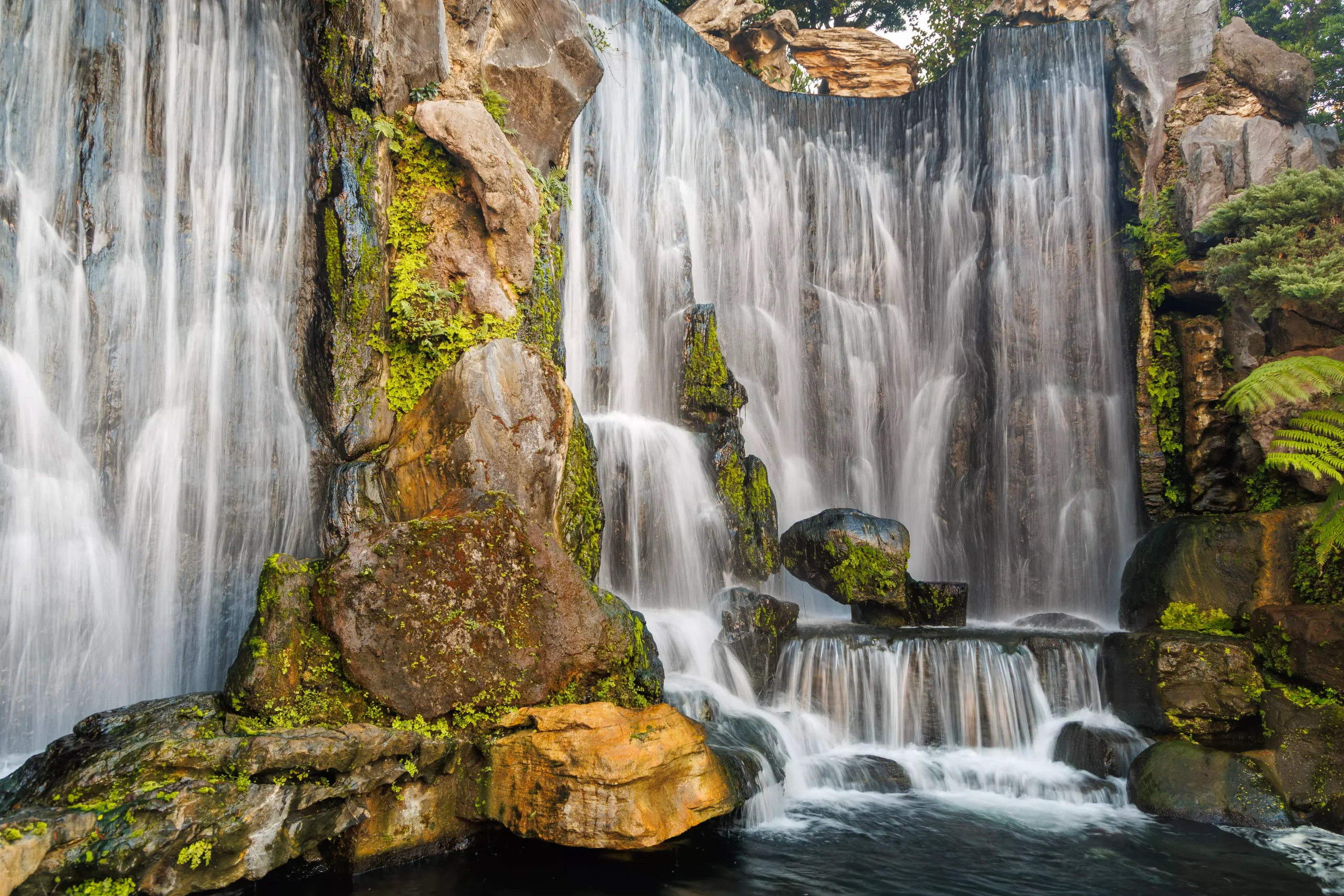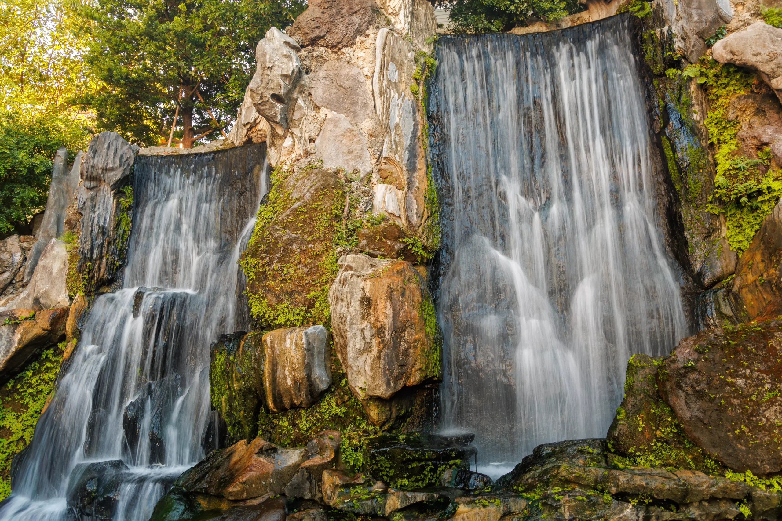 What surprised me most was the waterfall garden tucked to one side of the complex. I had not expected it at all. Two separate falls tumble over mossy boulders into a small pool, and I set up a long exposure to smooth out the water. The result was one of my favourite shots of the entire Taiwan trip. There is something quietly incongruous about finding that kind of serene natural detail inside a busy urban temple, and I think that contrast is part of what makes Longshan so special.